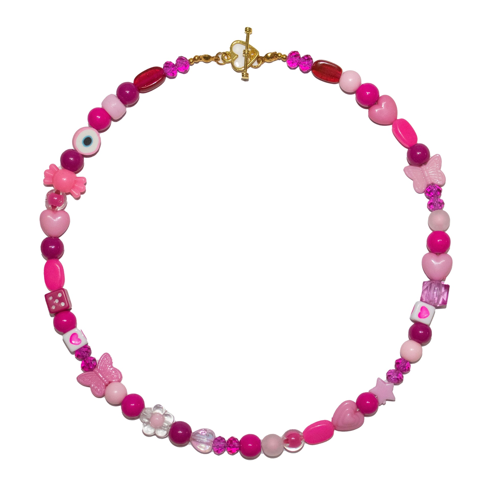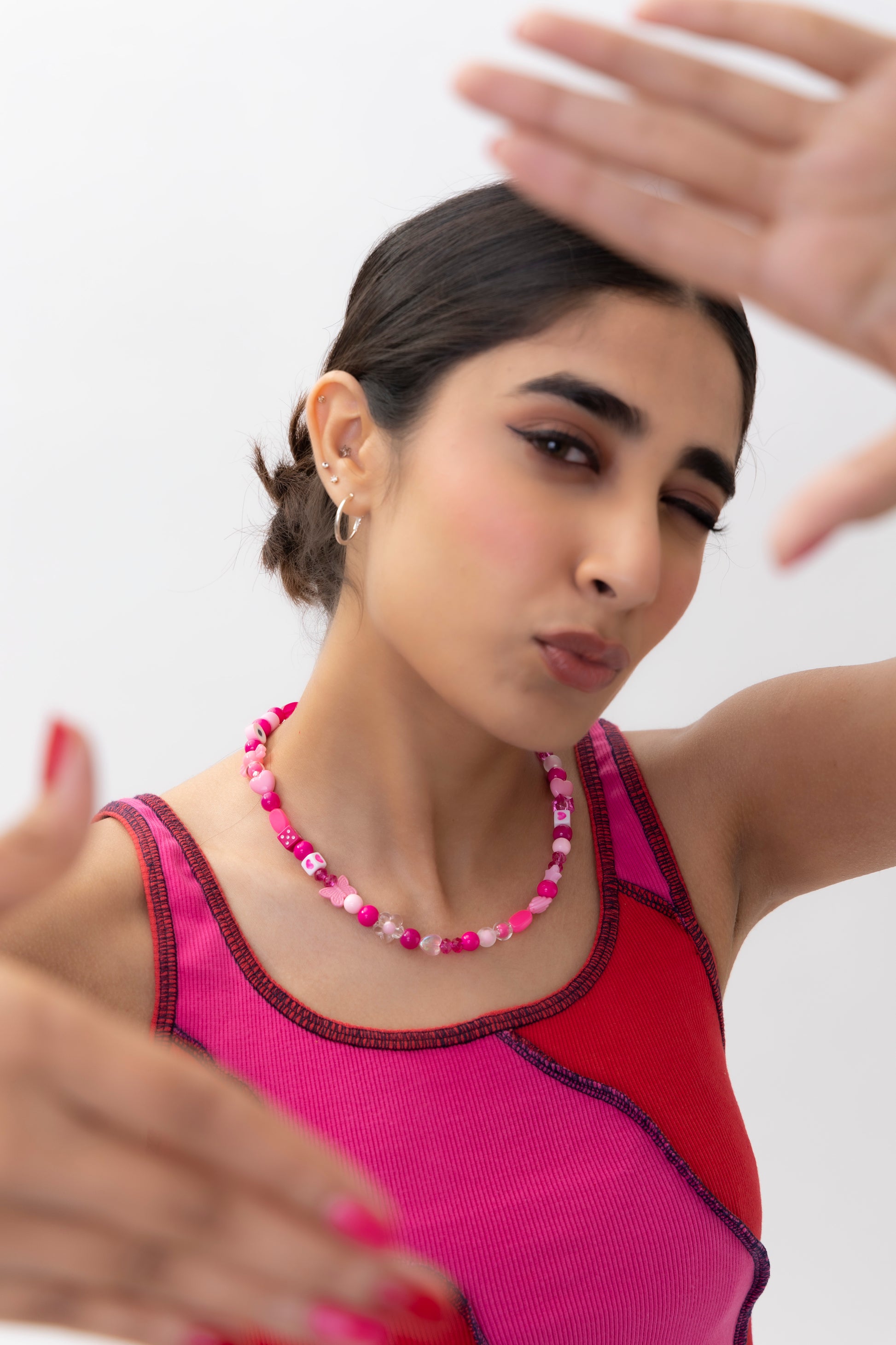 Get your pink on! This beaded necklace with all the shades of pink is the perfect accessory for you.